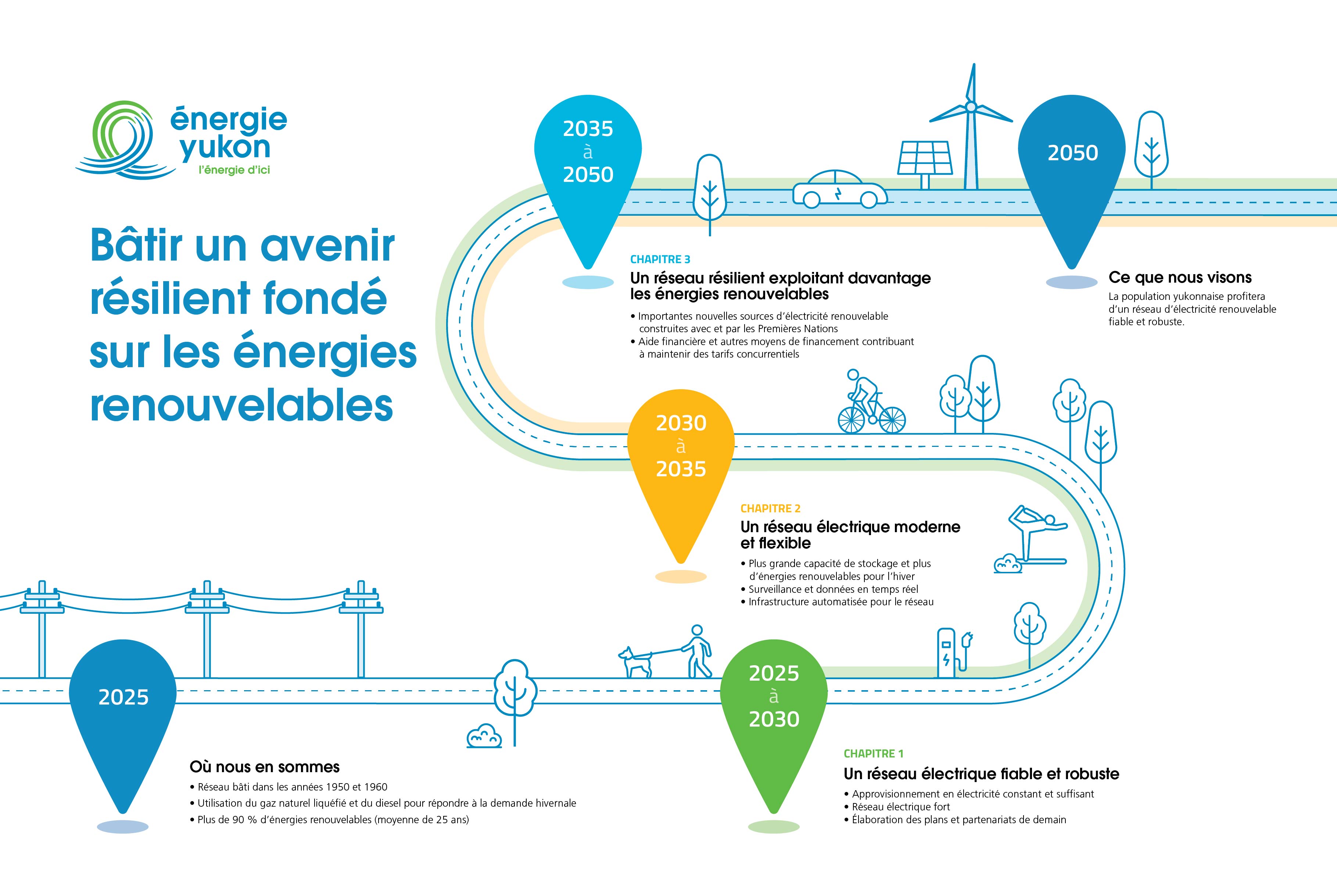 La feuille de route jusqu’en 2050 d’Énergie Yukon décrit notre vision à long terme pour la création d’un réseau d’électricité renouvelable plus résilient. Elle sert de cadre visant à garantir à la population yukonnaise un approvisionnement fiable en électricité pour les 25 prochaines années. Les travaux que nous entreprenons nous aideront à définir la voie à suivre pour les prochains projets d’énergies renouvelables de grande ampleur et les technologies émergentes dans ce domaine, le tout dans le but de soutenir la croissance continue du Yukon.